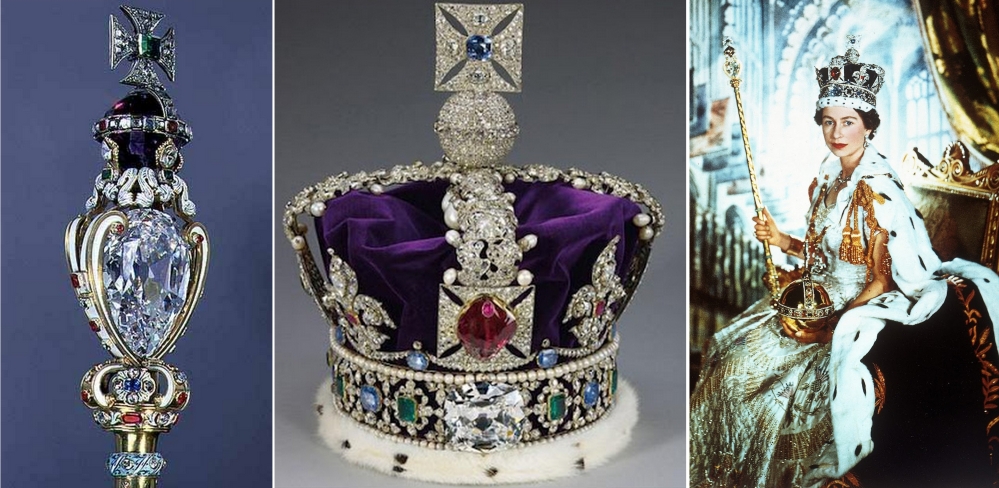 Скипетр и корона Британской Империи с огромными бриллиантами "Куллинан I" и "Куллинан II", Остальные семь бриллиантов были использованы для создания перстня, ожерелья и трёх брошей - эти произведения ювелирного искусства можно лицезреть на выставке в Букингемском дворце. |