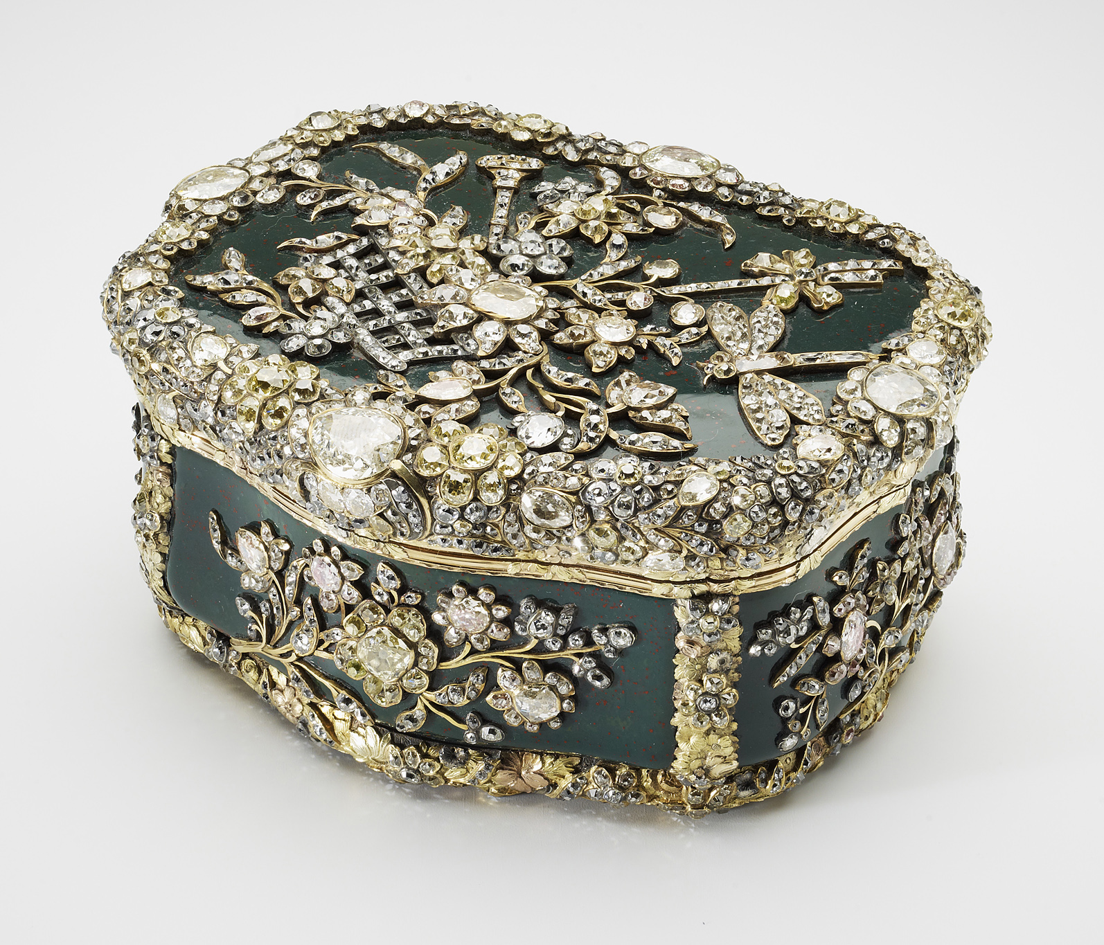 Еще один интересный экспонат выставки (на которой можно увидеть не только восхитительные украшения, но и предметы искусства) - табакерка с тремя тысячами бриллиантов, изготовленная примерно в 1770 году и принадлежавшая когда-то королю Пруссии Фридриху II. Позднее она перешла по наследству супруге российского императора Николая II Александре Федоровне. Табакерка была обнаружена среди имущества царской семьи, конфискованного после революции 1917 года и оказавшегося в Англии. Она была приобретена королевой Марией в 1932 году и с тех пор является частью коллекции британских монархов.