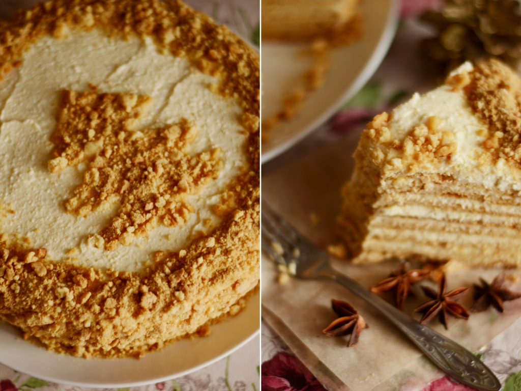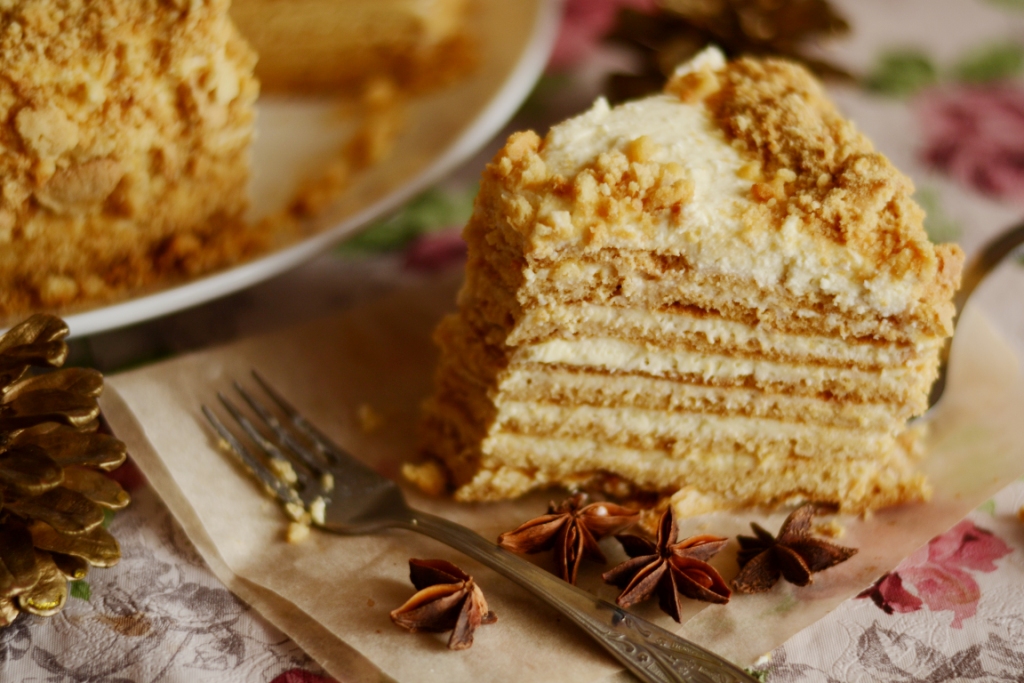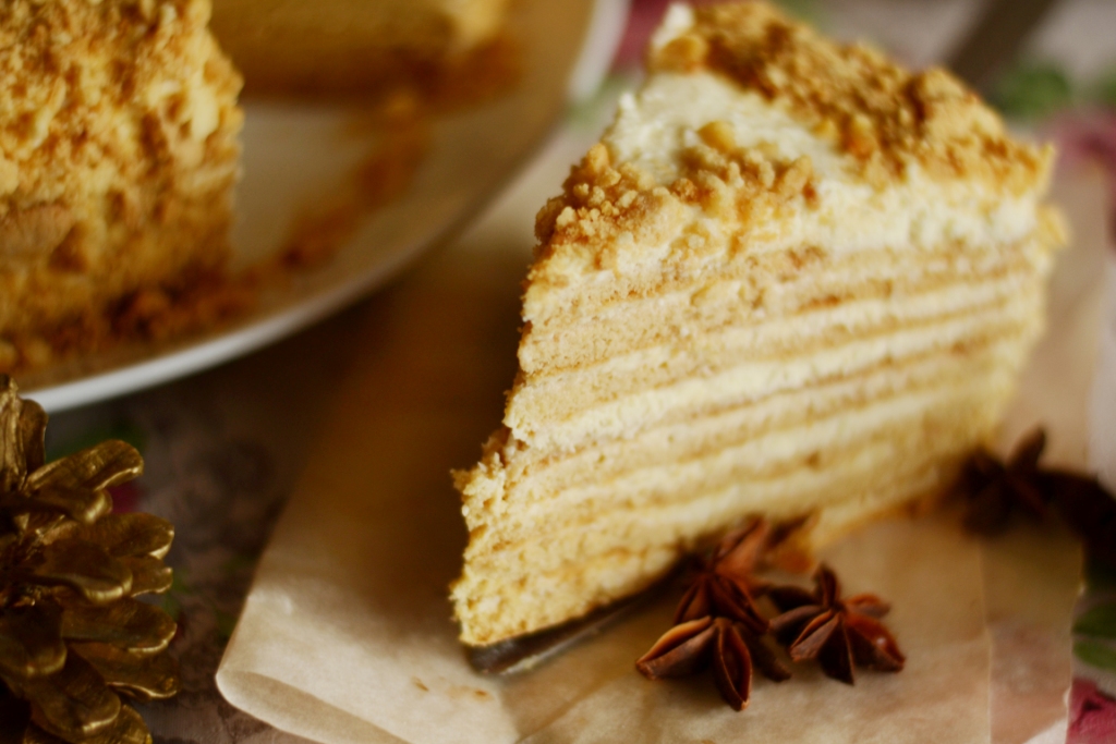 Мягкие коржи с легкой медовой ноткой, ванильный, легкий, сливочный крем - дуэт просто превосходный. Готовится торт достаточно легко, просто много времени идет на то, чтобы раскатывать каждый корж, ждать, пока он испечется, обрезать его и снова всё сначала, и так 8 раз подряд :D