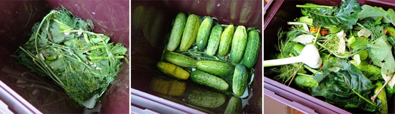 - Когда огурцы будут готовы (приобретут оливковый цвет и приятный кисловатый вкус), собери сверху всю зелень, промой под проточной водой и положи обратно. Закрой емкость крышкой и убери для хранения в прохладное место. Это может быть холодильник, балкон или погреб.