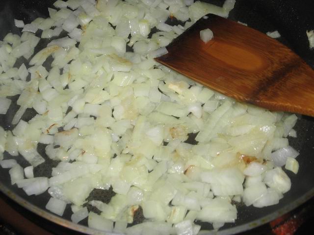 Обжарить репчатый лук, добавить нарезанное мясо, посолить, поперчить.