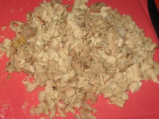 Сваренные окорочка очистить от кожицы, мелко порезать.