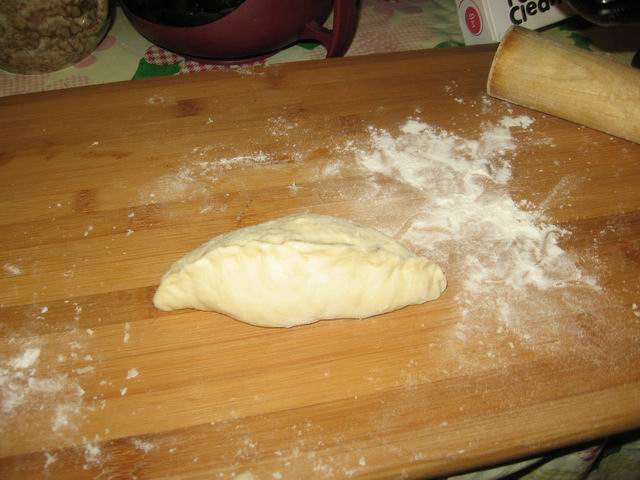Защипываем пирожок. При разделке теста не надо много муки - тесто достаточно послушное, не липнет ни к рукам, ни к разделочной доске.