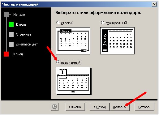 Откроется новое окно Мастера календарей, в котором нам необходимо выбрать стиль будущего календаря (выбираем – Изысканный).