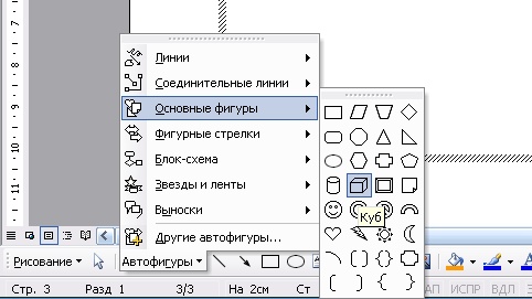 Этот квадратик в центре можете вырезать (щелкните на нем правой кнопкой мыши и в выпадающем меню выберите – Вырезать -). Выделите прямоугольник, в котором мы будем рисовать. На панели – Рисование – откройте – Автофигуры – Основные фигуры – Куб – и кликнете мышкой на поле выделенного прямоугольника.