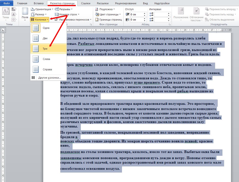 Выделите весь текст (или часть документа), который вам необходимо разбить на колонки, и нажмите в меню - Разметка страницы– на кнопку – Колонки -, и выберите необходимое количество колонок. Я для примера выбрала три колонки.