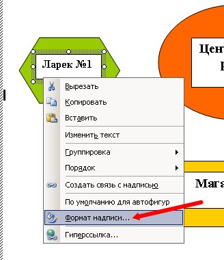 По умолчанию надпись заключается в прямоугольную рамку. Если же нужно наложить надпись на фигуру другого вида, эту рамку следует удалить. Для этого надо щелкнуть на рамке с надписью правой кнопкой мыши и выбрать в контекстном меню пункт Формат надписи.