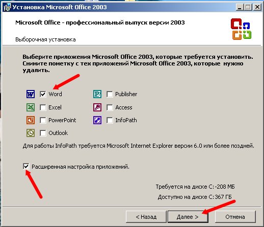 Если откроется экран Выборочная установка, установите флажок Расширенная настройка приложенийи нажмите кнопку Далее.