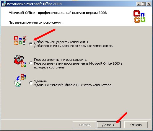В диалоговом окне Параметры режима сопровождения выберите Добавить или удалить компоненты, а затем нажмите кнопку Далее.