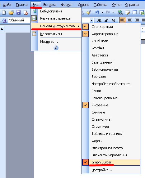 Если кнопка не появилась на вашей панели, то войдите в меню Вид – Панель инструментов и выберите GraphBuilder.
