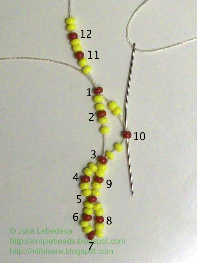 Набираем на иглу бисеринки в следующем порядке: 2 жёлтые, 1 коричневая, 2 жёлтые, 1 коричневая и ещё 2 жёлтые. Продолжаем нумеровать коричневые бисеринки - они будут номер 11 и номер 12.