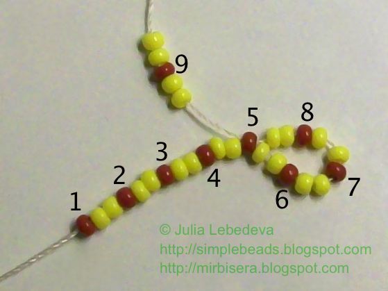 Далее набираем на иглу 2 жёлтые, 1 коричневую и ещё 2 жёлтые бисеринки. Коричневую бисеринку снова мысленно нумеруем, продолжая последовательность - это будет коричневая бисеринка номер 9.