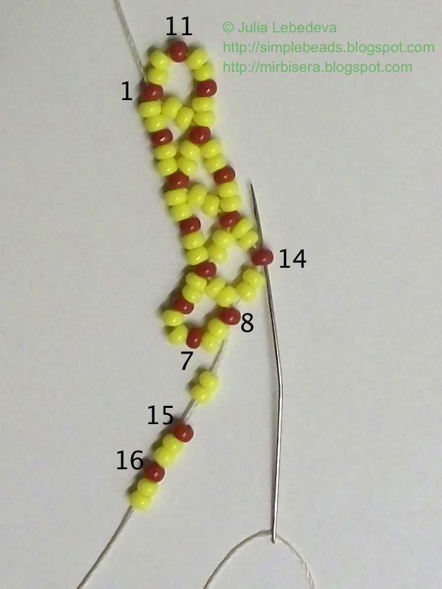 Набираем на иглу бисеринки в следующем порядке: 2 жёлтые, 1 коричневая, 2 жёлтые, 1 коричневая и ещё 2 жёлтые. Продолжаем нумеровать коричневые бисеринки - они будут номера 15 и 16.