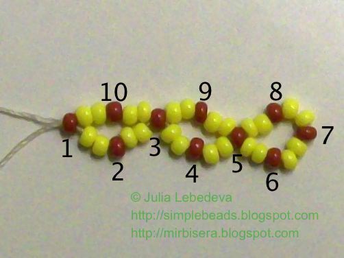 Снова набираем на иглу 2 жёлтые, 1 коричневую и ещё 2 жёлтые бисеринки. Коричневую бисеринку опять мысленно нумеруем - это будет коричневая бисеринка номер 10.