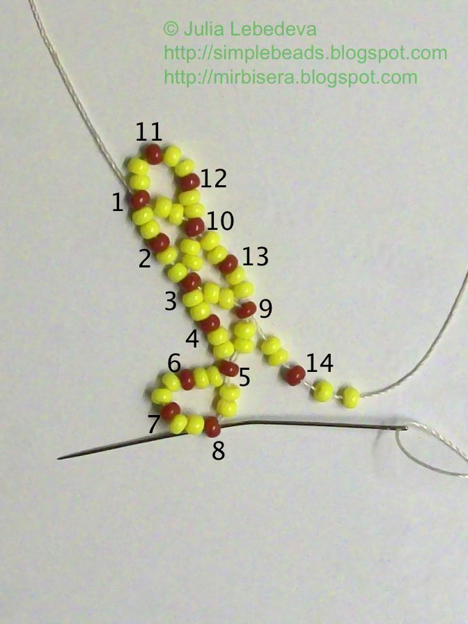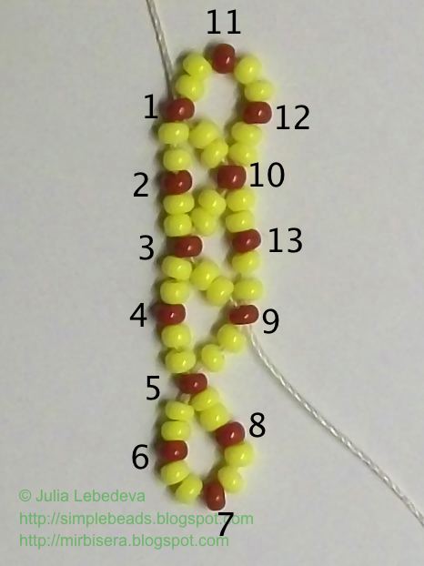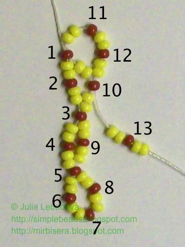 Снова набираем на иглу 2 жёлтые, 1 коричневую и ещё 2 жёлтые бисеринки. Коричневая бисеринка будет номером 13.