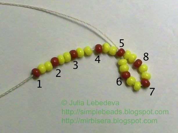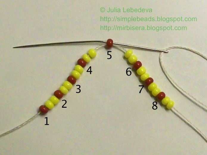 Пропускаем иглу через коричневую бисеринку номер 8.