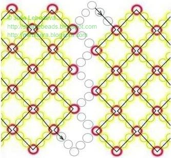 Далее сшиваем полотно, соединяя коричневые бисеринки, лежащие на его разных краях, отрезками из двух жёлтых бисеринок так, чтобы формировались характерные ромбики сетки. Всего будет 5 таких соединительных отрезков из двух жёлтых бисеринок.
