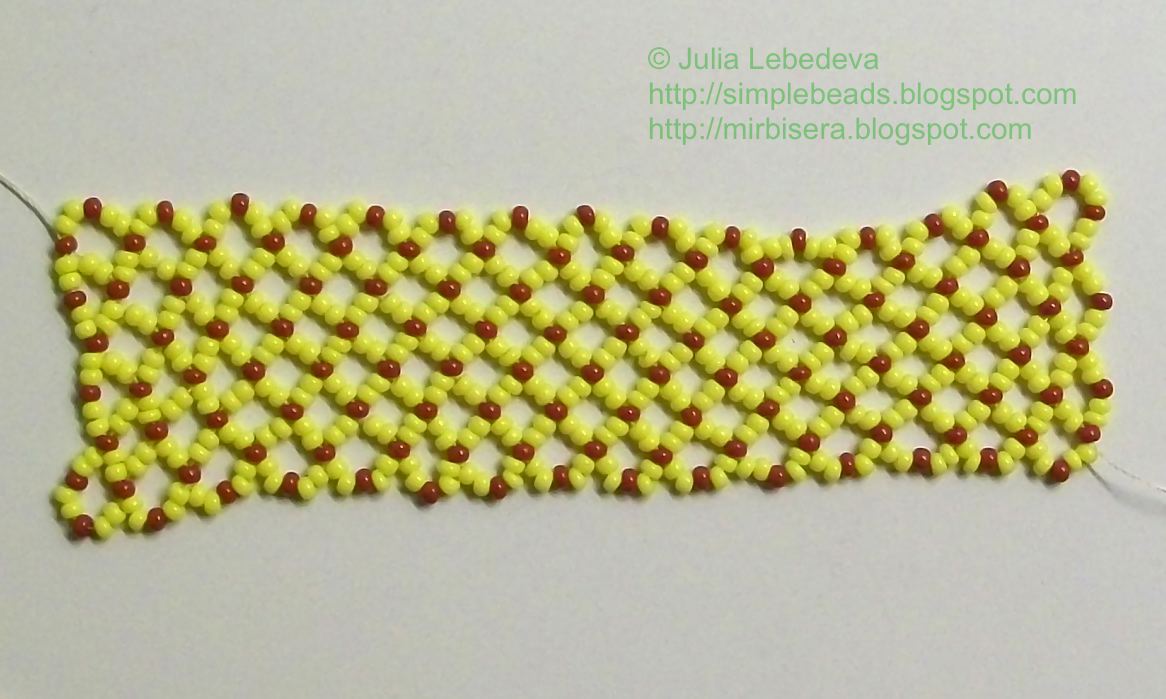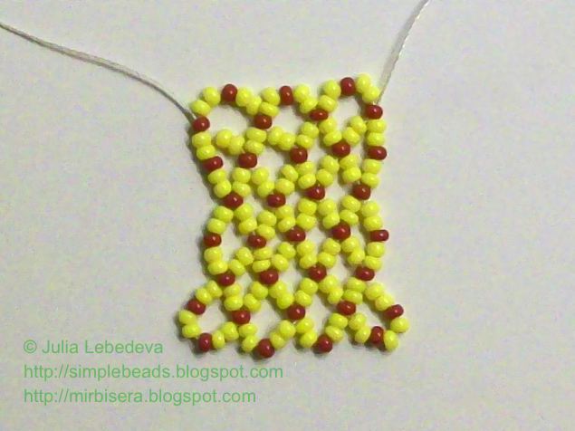 Продолжаем плести сетчатое полотно, добавляя бисеринки отрезками аналогичным образом. Все отрезки, лежащие в середине полотна, состоят из двух жёлтых, одной коричневой и двух жёлтых бисеринок. Для отрезков, образующих край полотна, набираем бисеринки в следующем порядке: 2 жёлтые, 1 коричневая, 2 жёлтые, 1 коричневая и ещё 2 жёлтые.