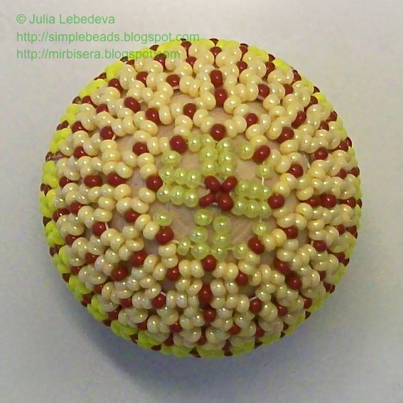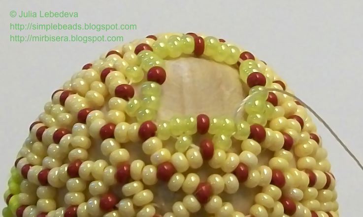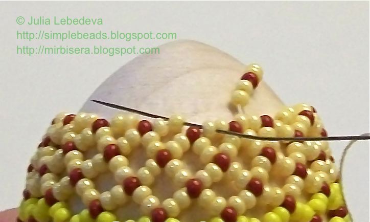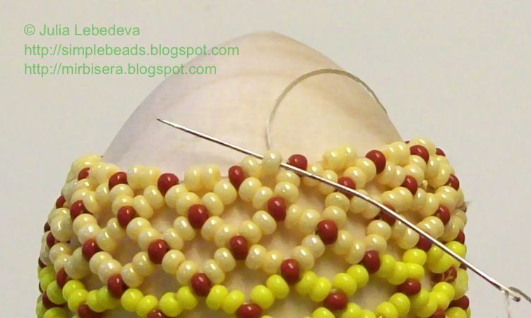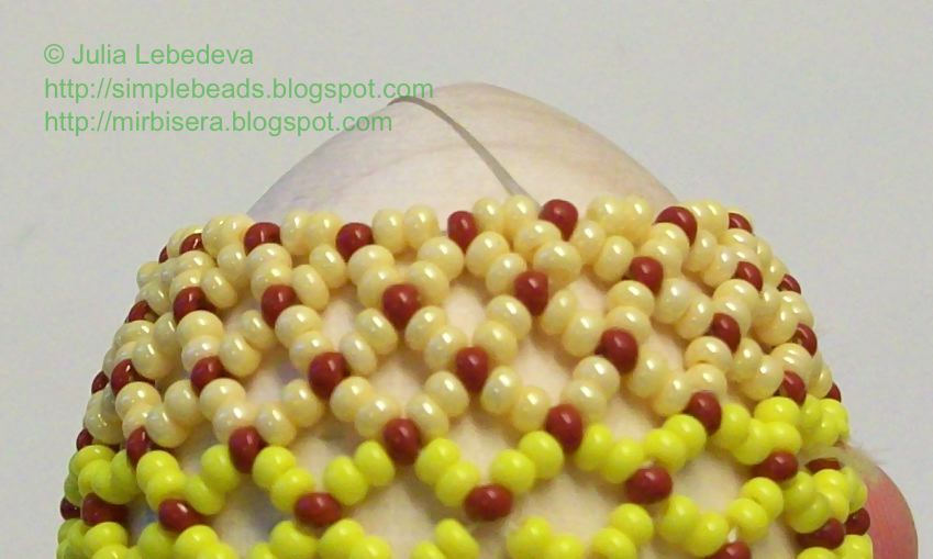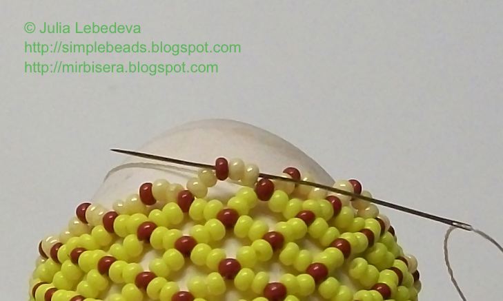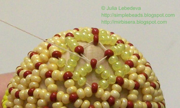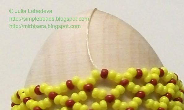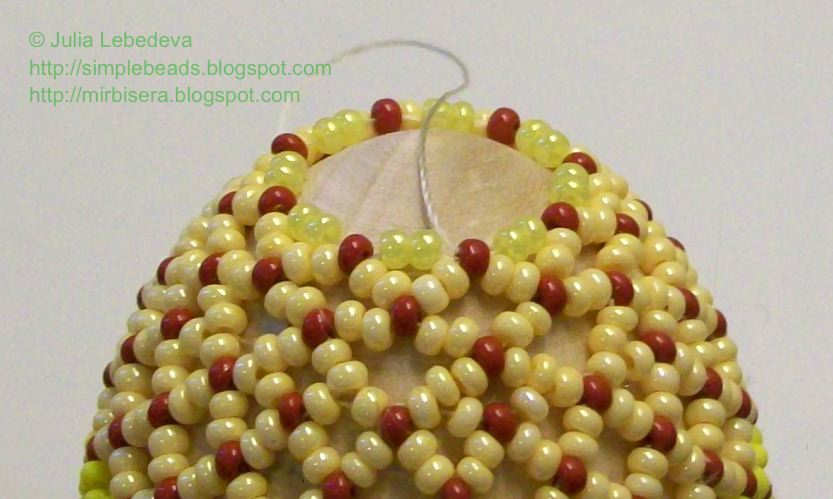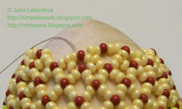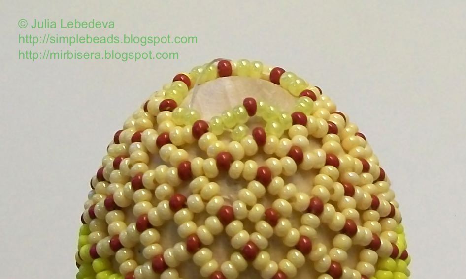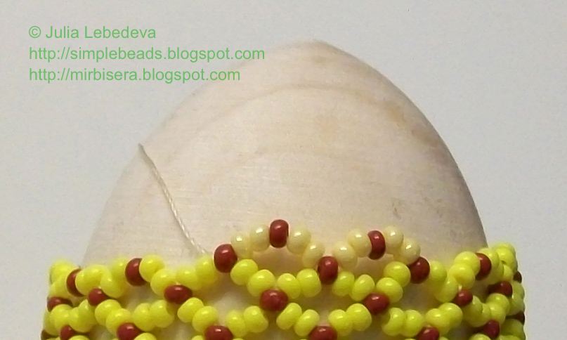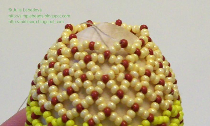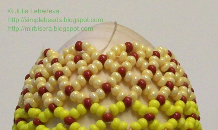 Таким образом проходим целый круг вокруг яйца. В итоге количество отрезков вокруг яйца (и, соответственно, количество коричневых бисеринок на верхнем крае) уменьшилось в два раза.
