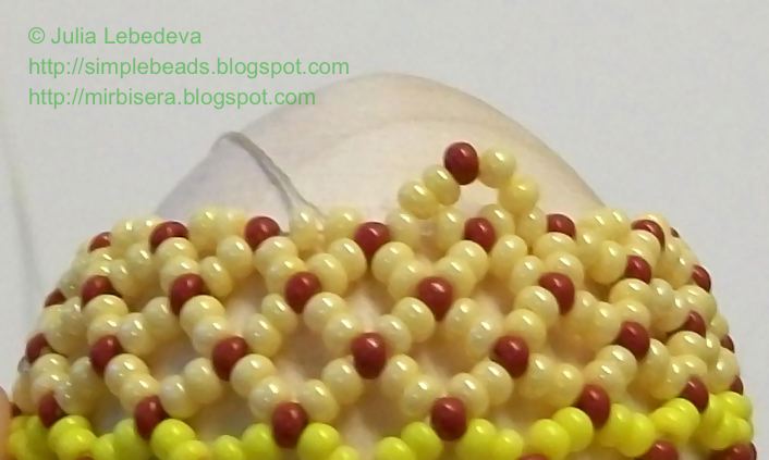 Сначала будем оплетать верхнюю часть яйца, а уже потом - нижнюю. Прежде всего, расширяем сетчатое полотно вверх, добавляя между коричневыми бисеринками дополнительные отрезки бисеринок, состоящие из 2 жёлтых, 1 коричневой и ещё 2 жёлтых бисеринок. Схема плетения следующая: