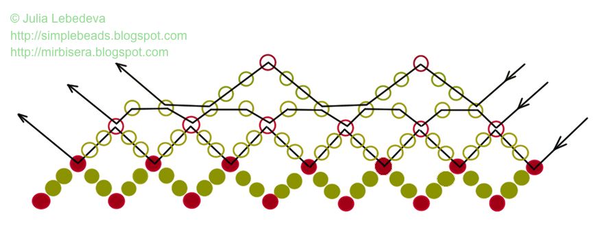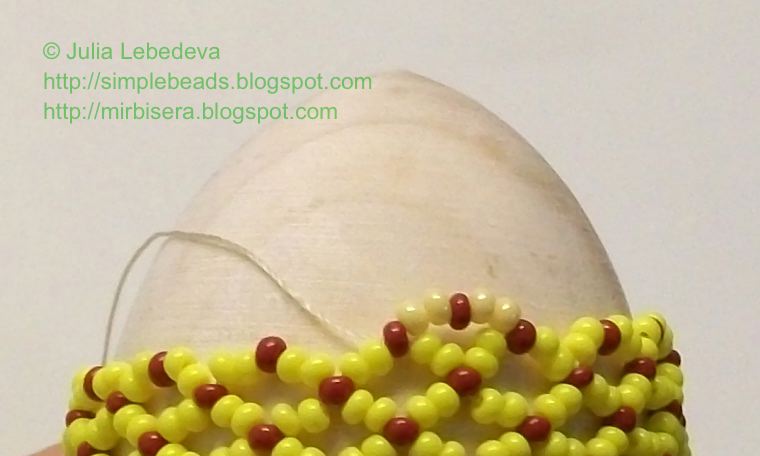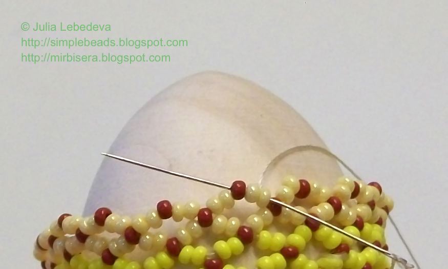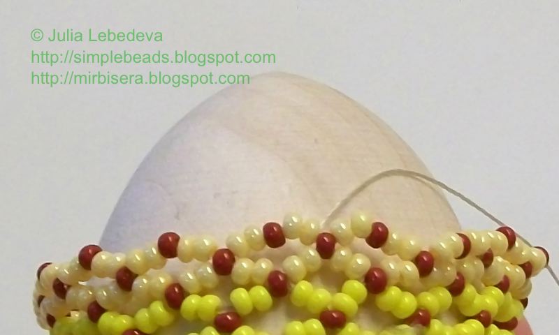 По окончании каждого круга не забываем выводить нить к коричневой бисеринке на самый верх плетения.
