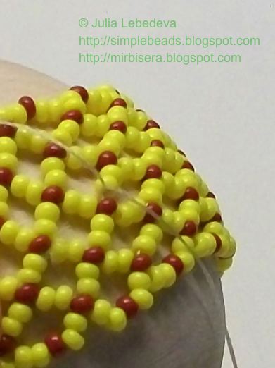 Сначала набираем между коричневыми бисеринками на верхнем крае полотна дополнительные отрезки бисеринок, состоящие из 2 жёлтых бисеринок.