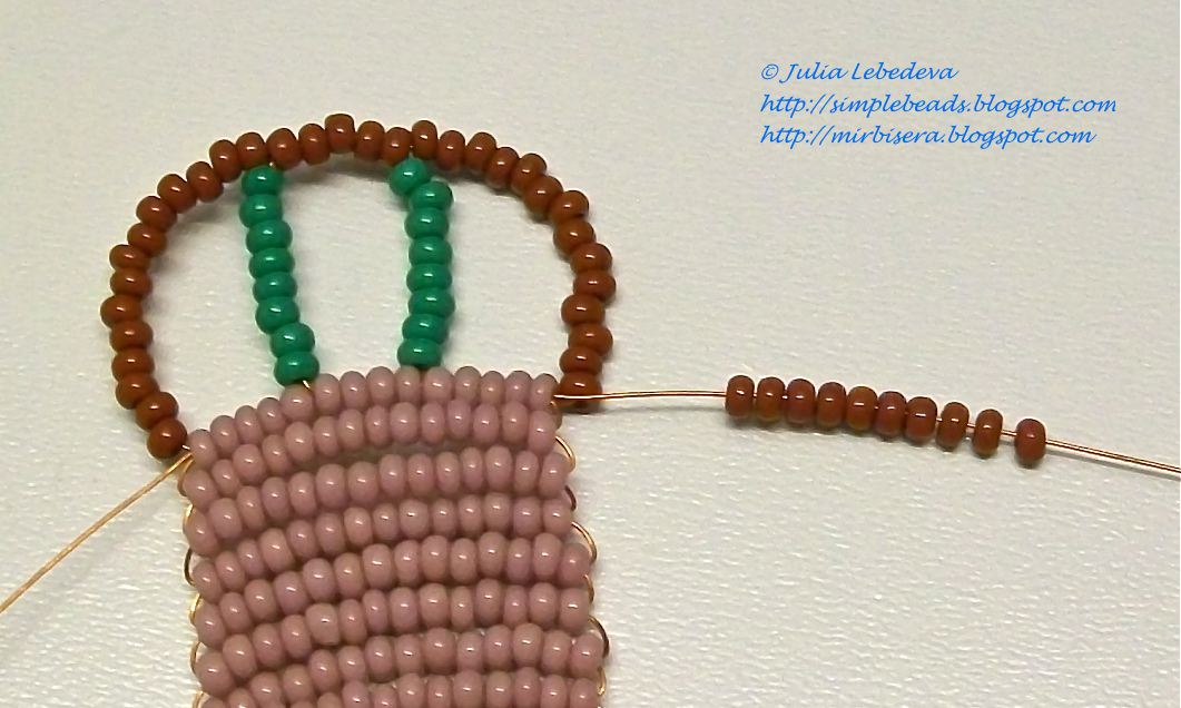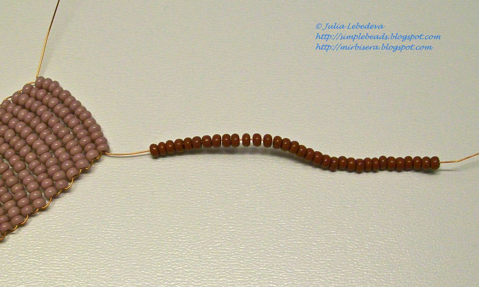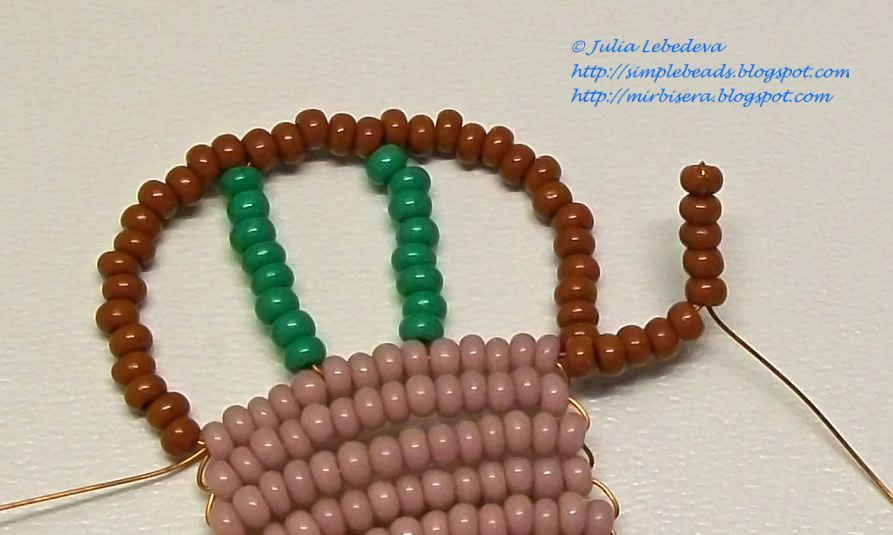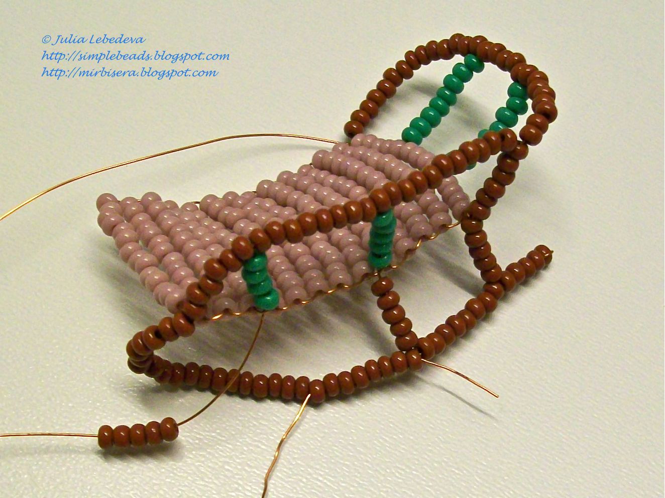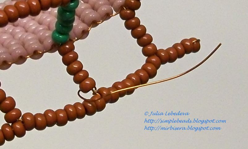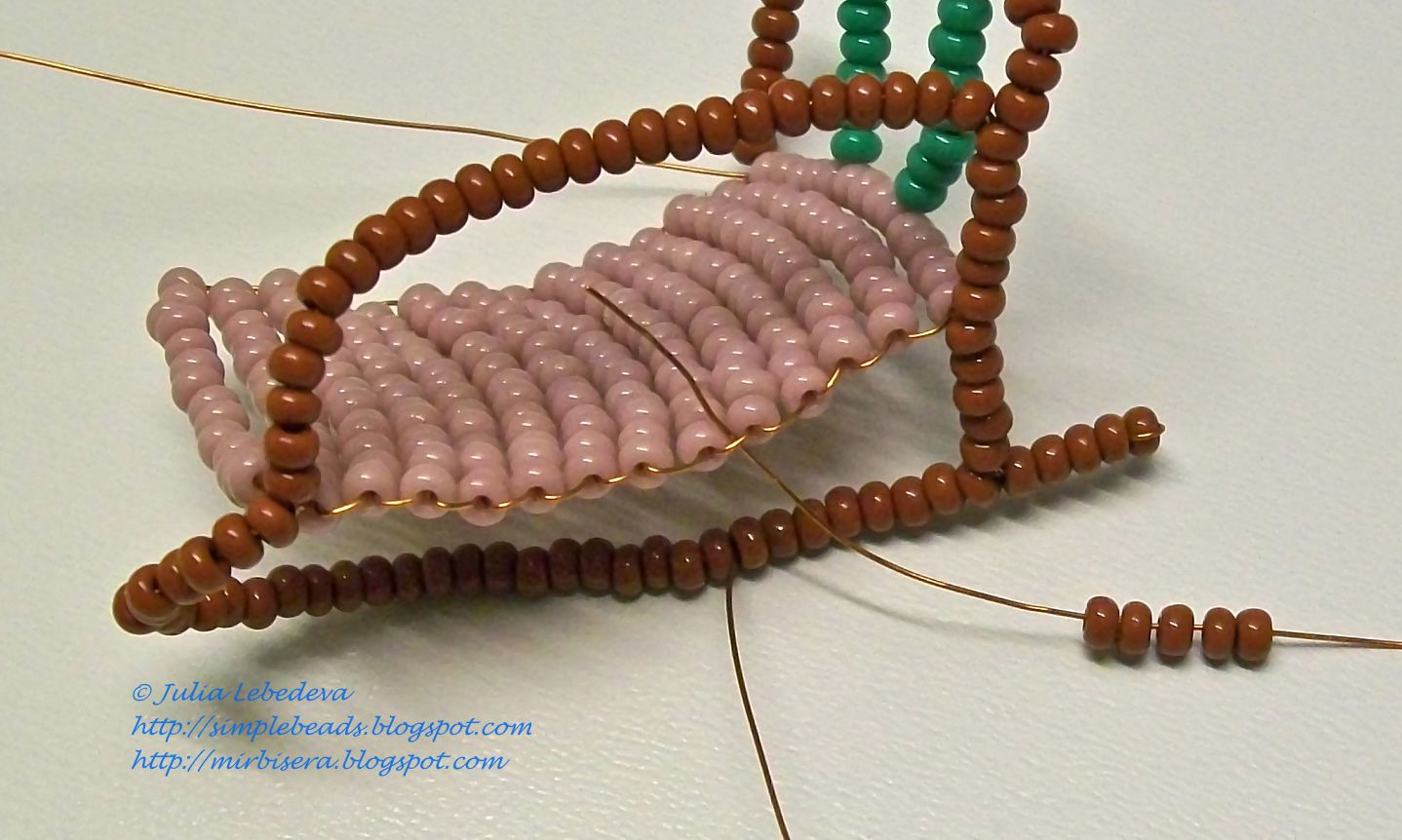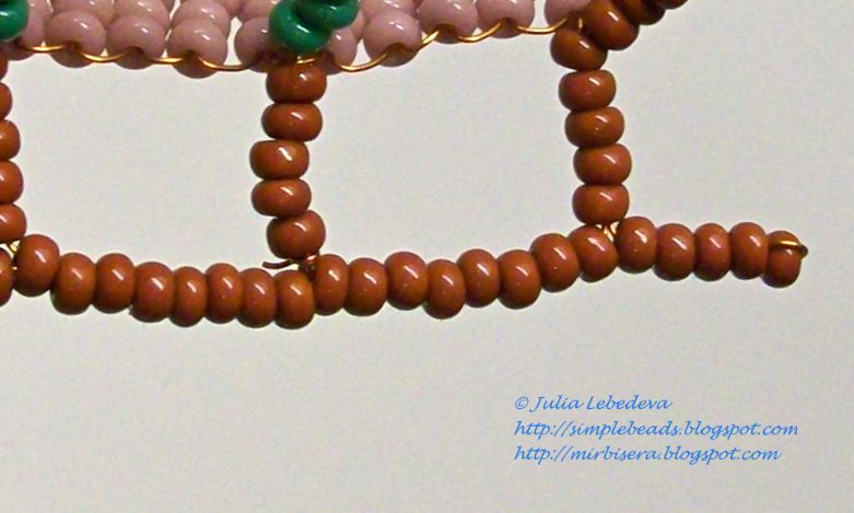 Далее набираем на этот конец проволоки 5 коричневых бисеринок и, ведя проволоку снизу вверх, пропускаем её между 9-ым и 10-ым рядами сиденья.