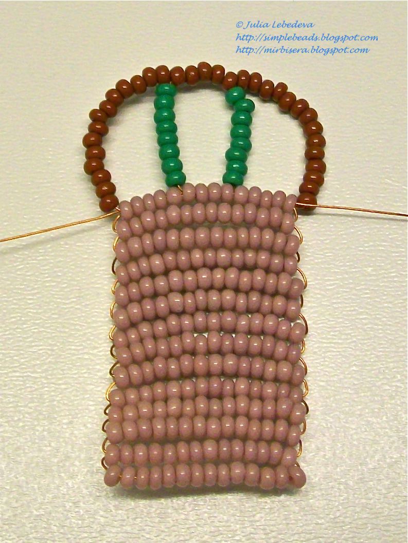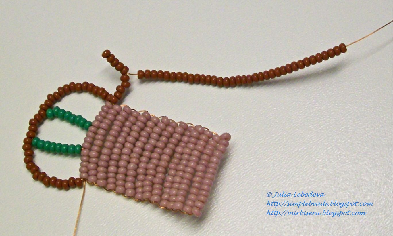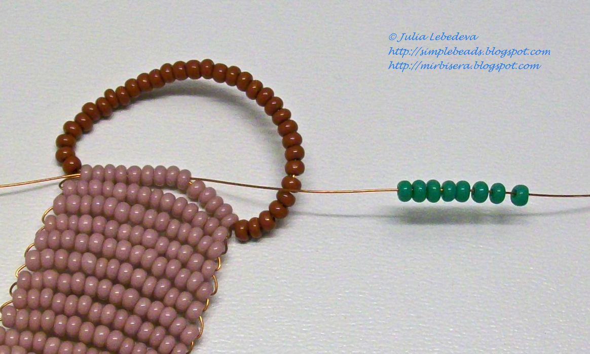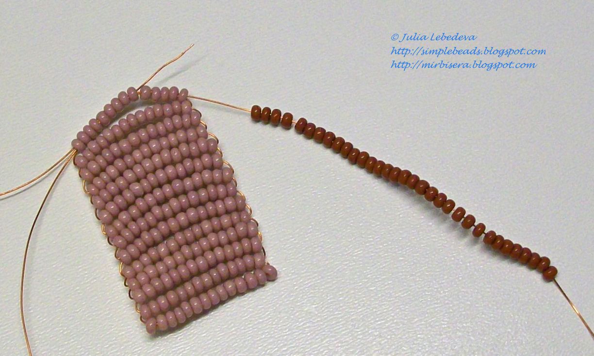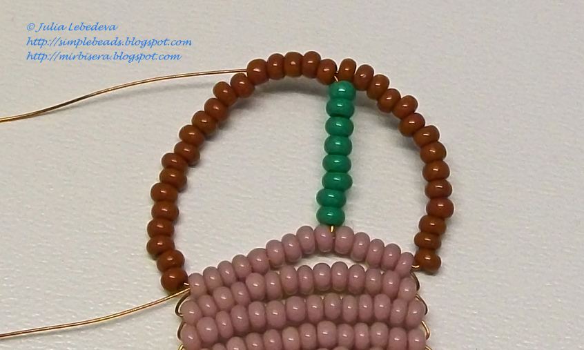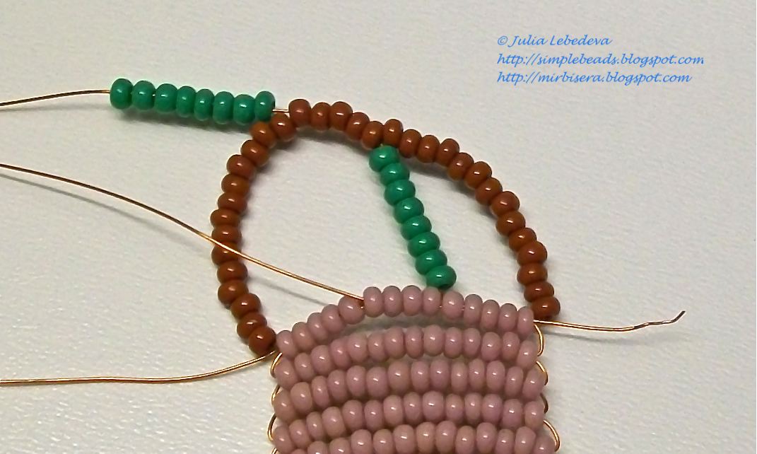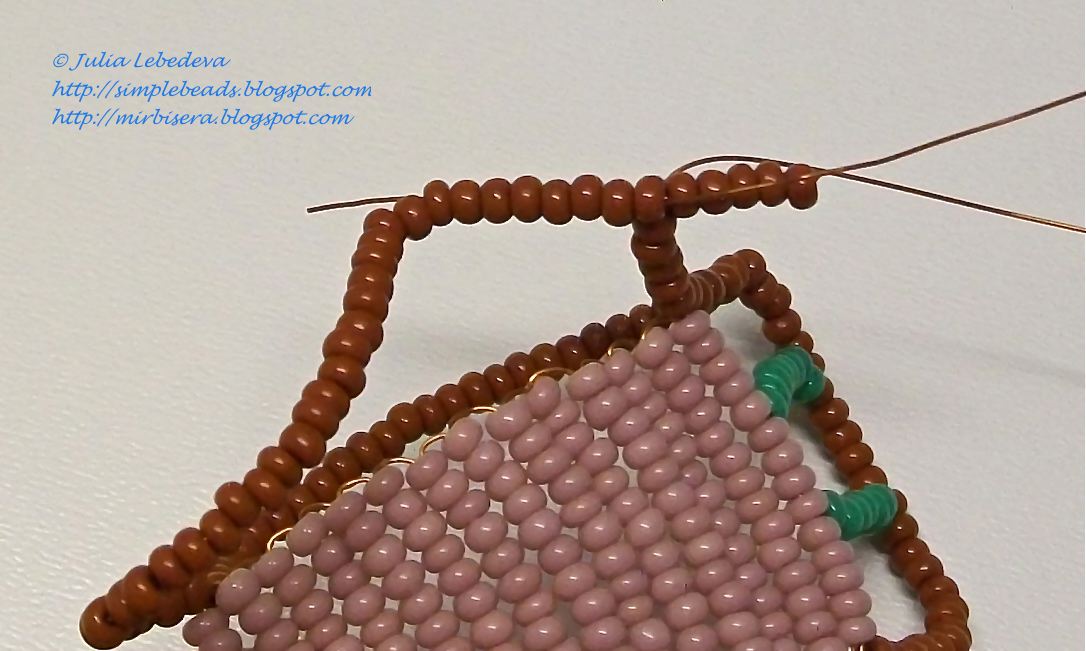 Далее набираем на этот конец проволоки 5 коричневых бисеринок и, ведя проволоку снизу вверх, пропускаем её между 9-ым и 10-ым рядами сиденья.