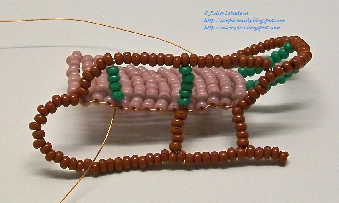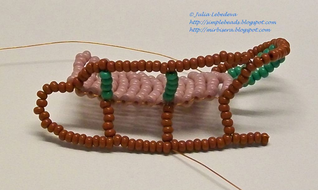 и, ведя проволоку сверху вниз, пропускаем этот конец проволоки сначала через 6 коричневых бисеринок внешней части спинки, примыкающих к сиденью, а затем сразу же - через 5 коричневых бисеринок, составляющих вертикальную опору между сиденьем и полозом санок.
