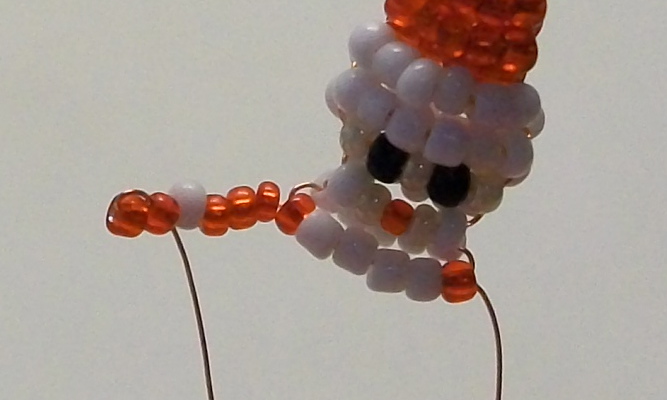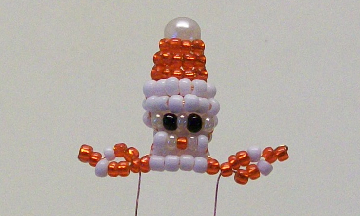 и пропускаем проволоку через самую первую красную бисеринку руки (ближайшую к туловищу Деда Мороза).