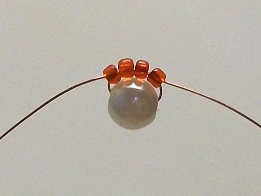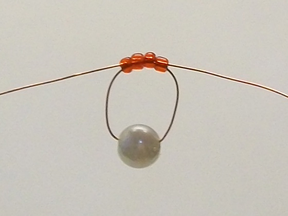 Сначала нанизываем на проволоку белую бусину и размещаем её на середине проволоки.