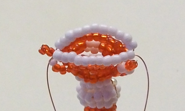 Верхний ярус - набираем на проволоку бисеринки в следующей последовательности: 1 белую, 1 бежевую, 1 красную, 1 бежевую, 1 белую.