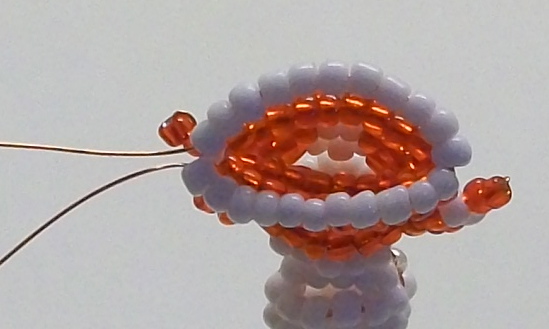 Далее плетём ряды из бисера, сразу же начинаем использовать объемное плетение и формировать верхние и нижние ярусы.