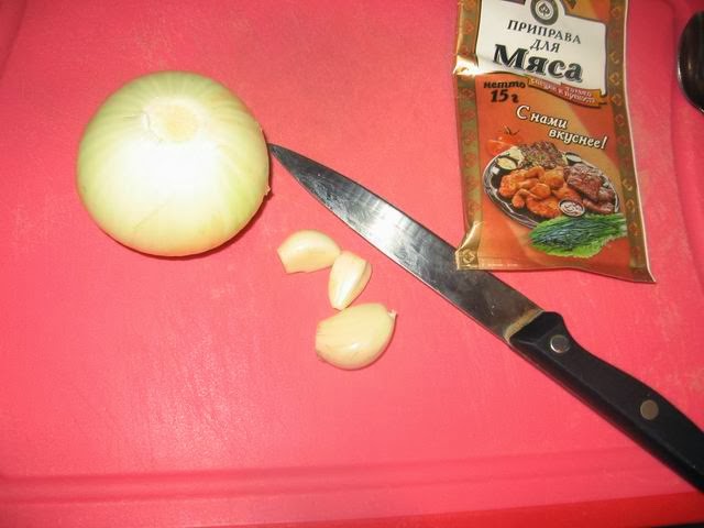 Приготовим лук, чеснок и припрау. Я использовала приправу для мяса.