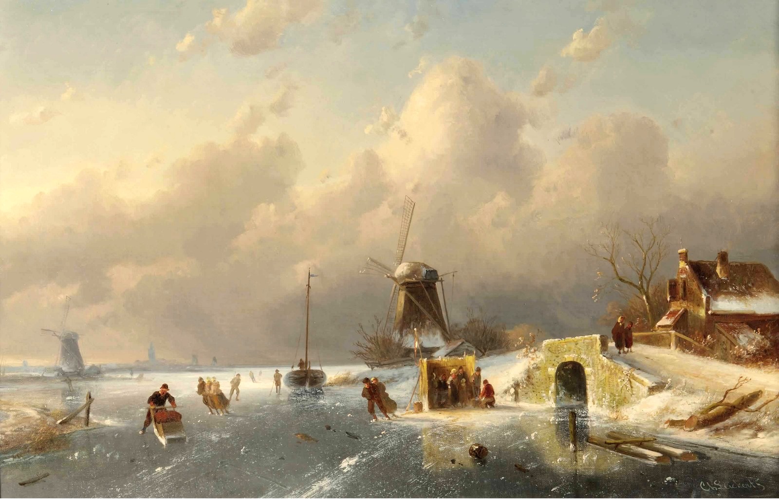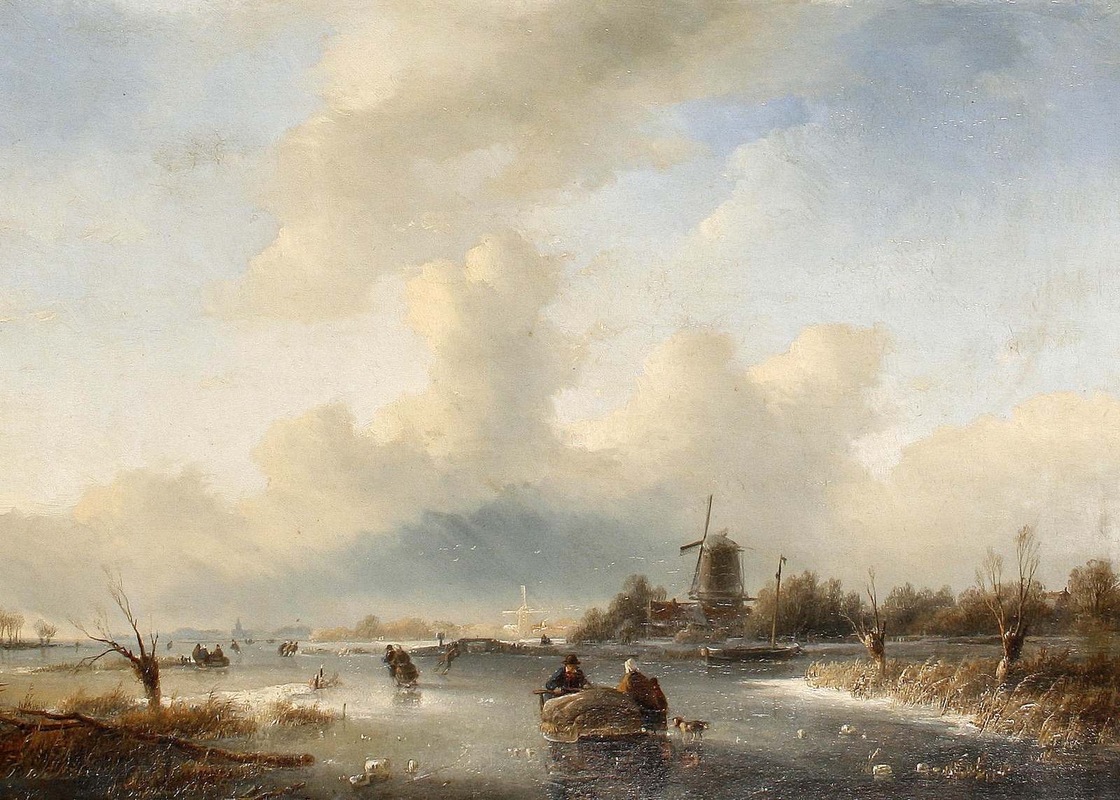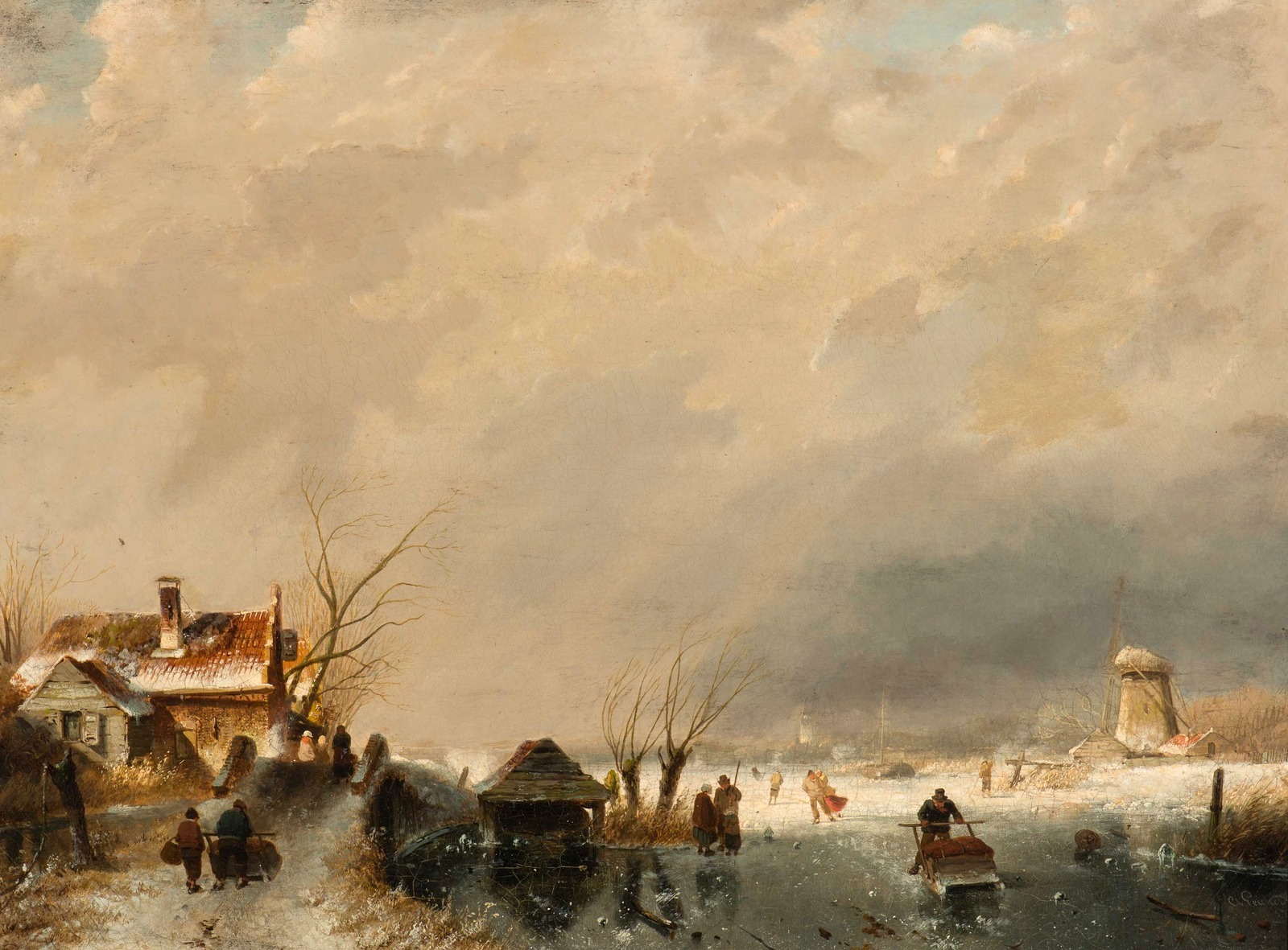 1879_Зимний пейзаж с фигурами на льду и мельницей (A winter landscape with figures on the ice by a windmill)_64.5 x 101.1_х.,м._Частное собр