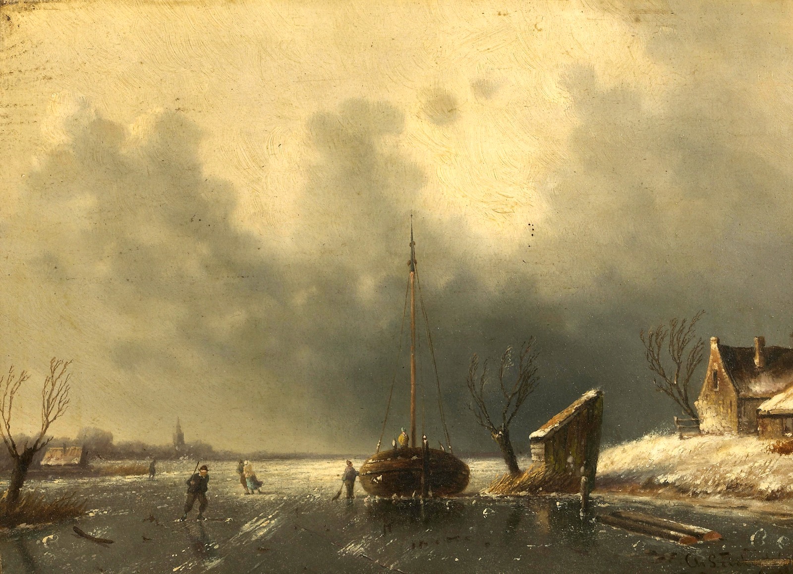 Зимняя сцена с фигурами в лодке на замерзшей реке (A winter landscape with skaters on a frozen waterway)_23.5 x 32.4_д.,м._Частное собрание