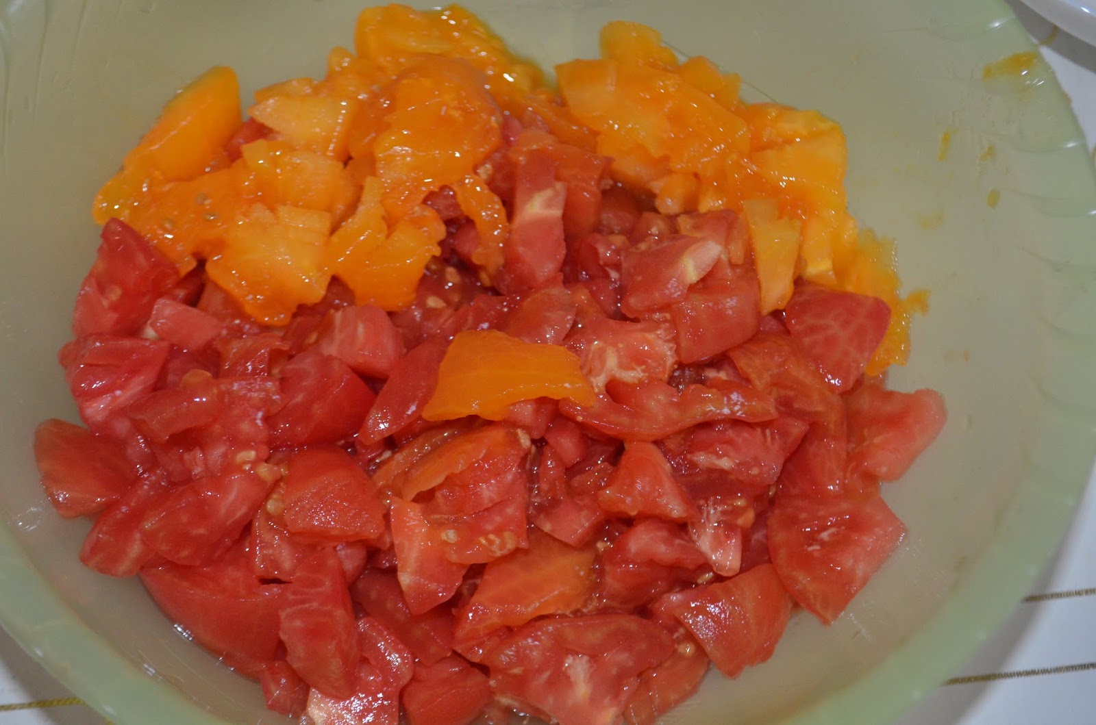 2) Половину томатов обдать кипятком и дать им так постоять. Затем снять также с них кожу. Мело нарезать их.