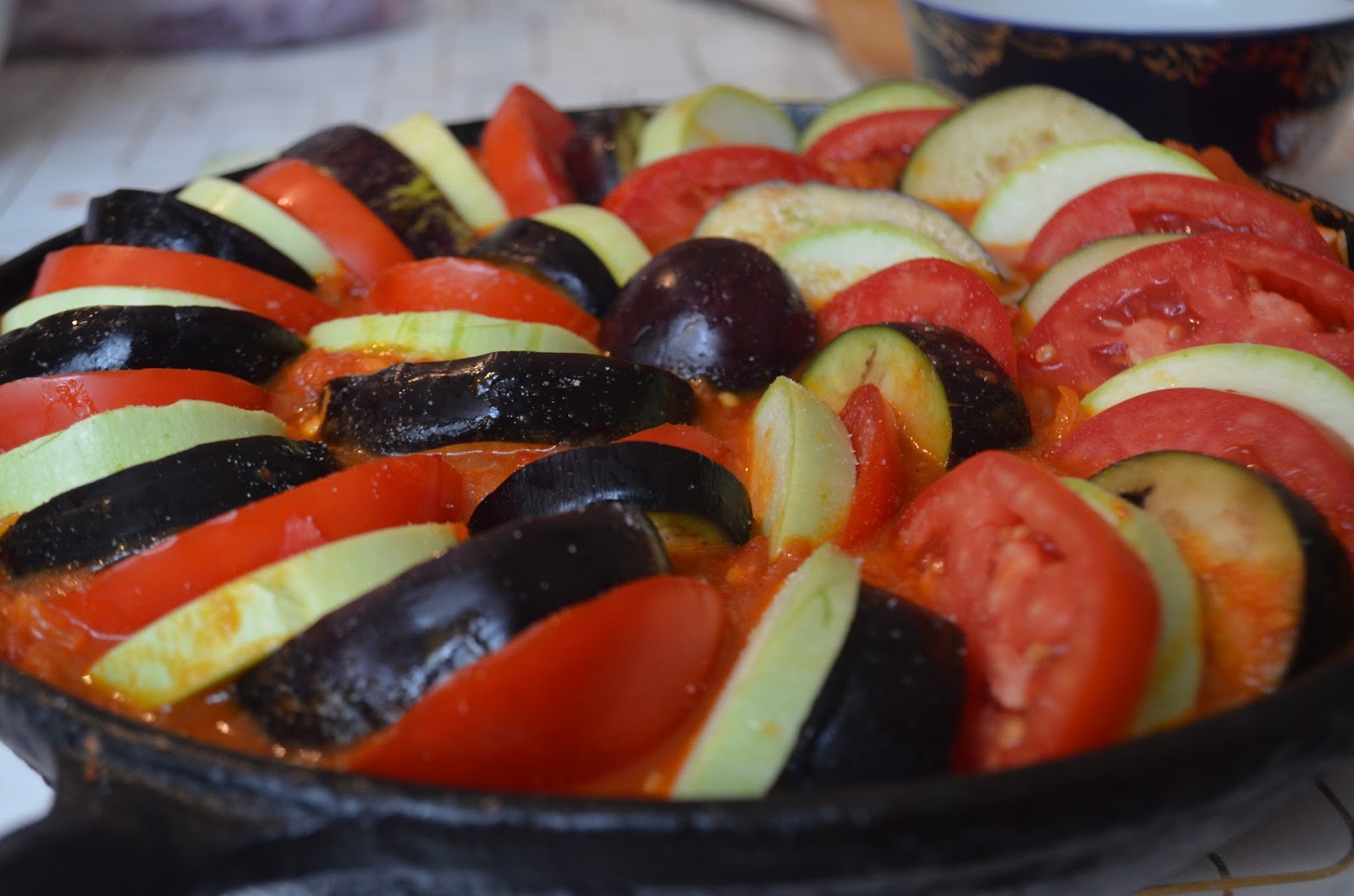 6) К сковороду для запекания или в форму вылить соус и уложить в него овощи по кругу, чередую кабачок, баклажан и томат. Все овощи должны лежать аккуратно и одновременно утопать в соусе примерно наполовину.