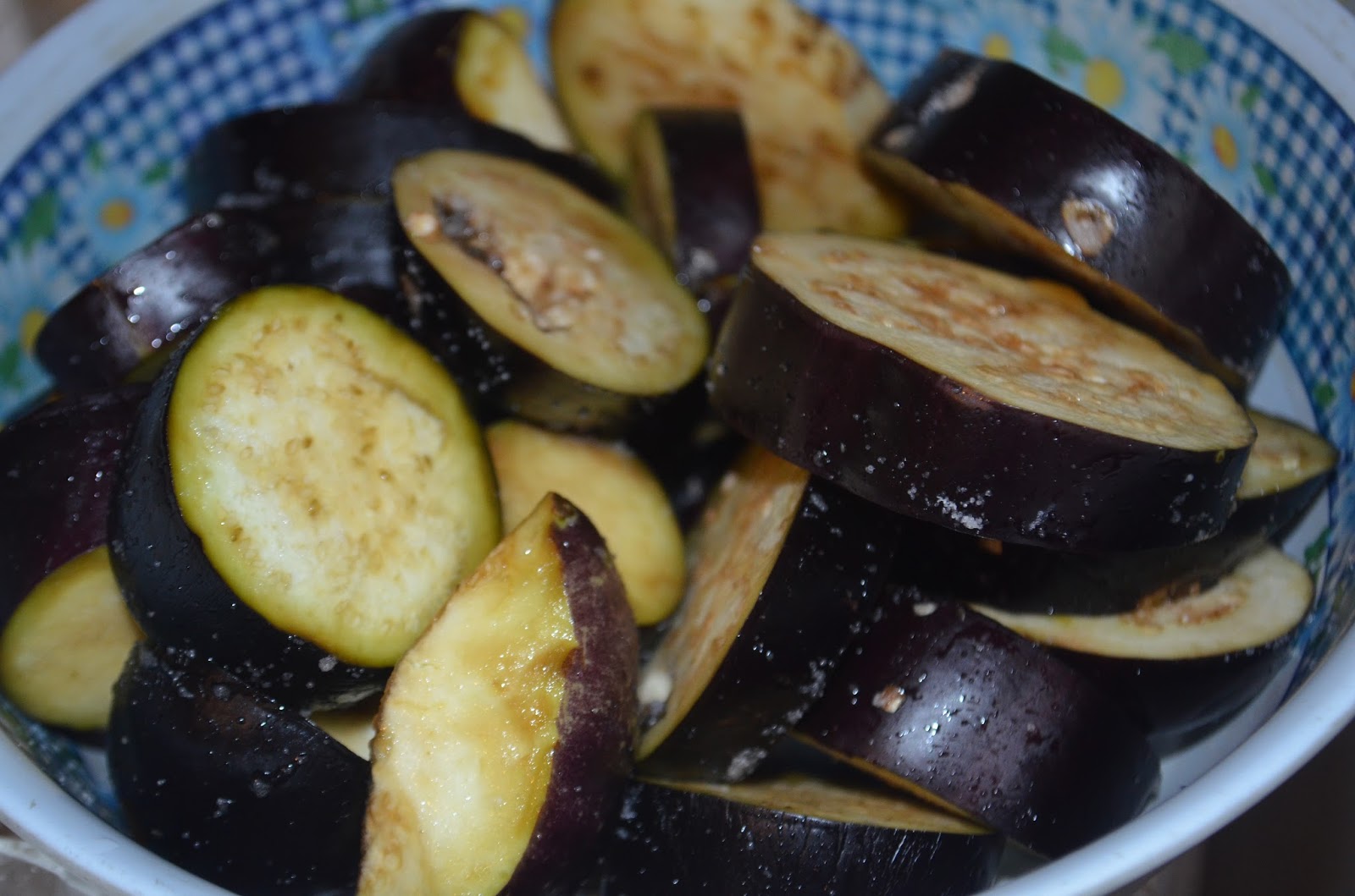 3) Баклажаны помыть, на резать кольцами 1 см, обильно посыпать солью и так оставить на 15 минут, за это время они потемнеют и с них уйдет вся горечь. Затем мы их должны промыть под проточной водой.