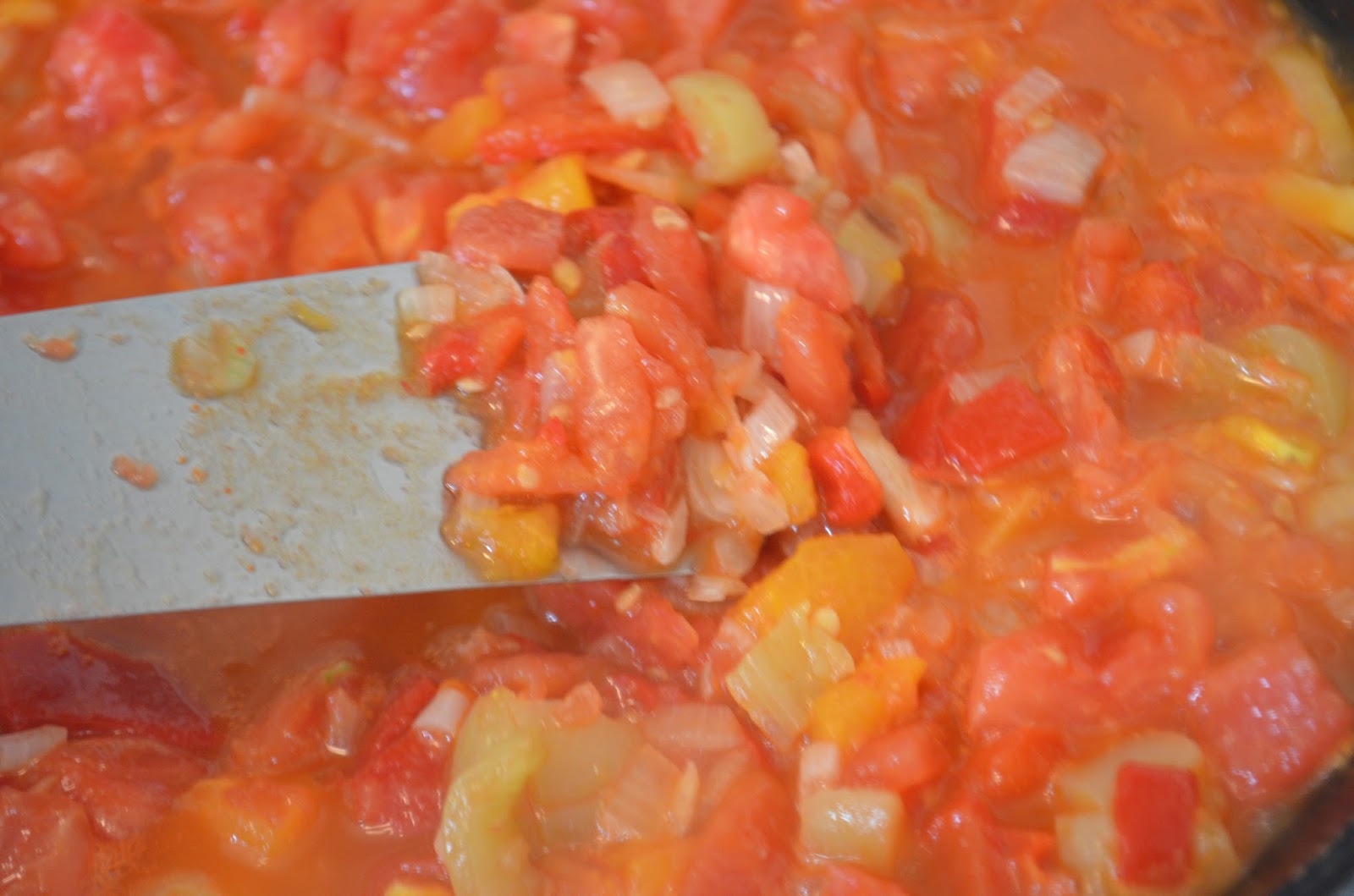 4) Лук и чеснок мелко нарубить и обжарить на оливковом масле, добавить подготовленные томаты, болгарский перец и потушить примерно 10 минут. Посолить, добавить травы.