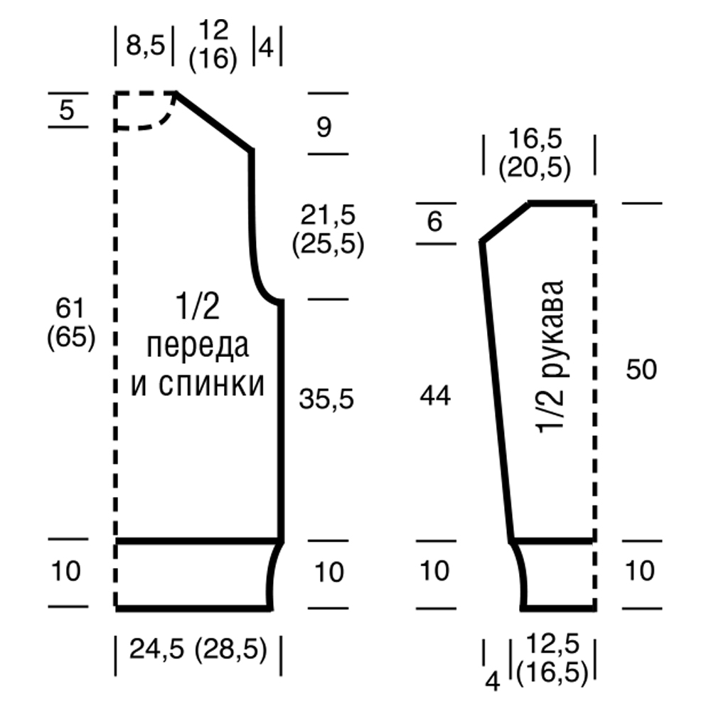 Вязать, как спинку, но через 61 см = 158 рядов (65 см = 168 рядов) от нижней планки отложить для горловины средние 22 п. и обе стороны закончить раздельно.