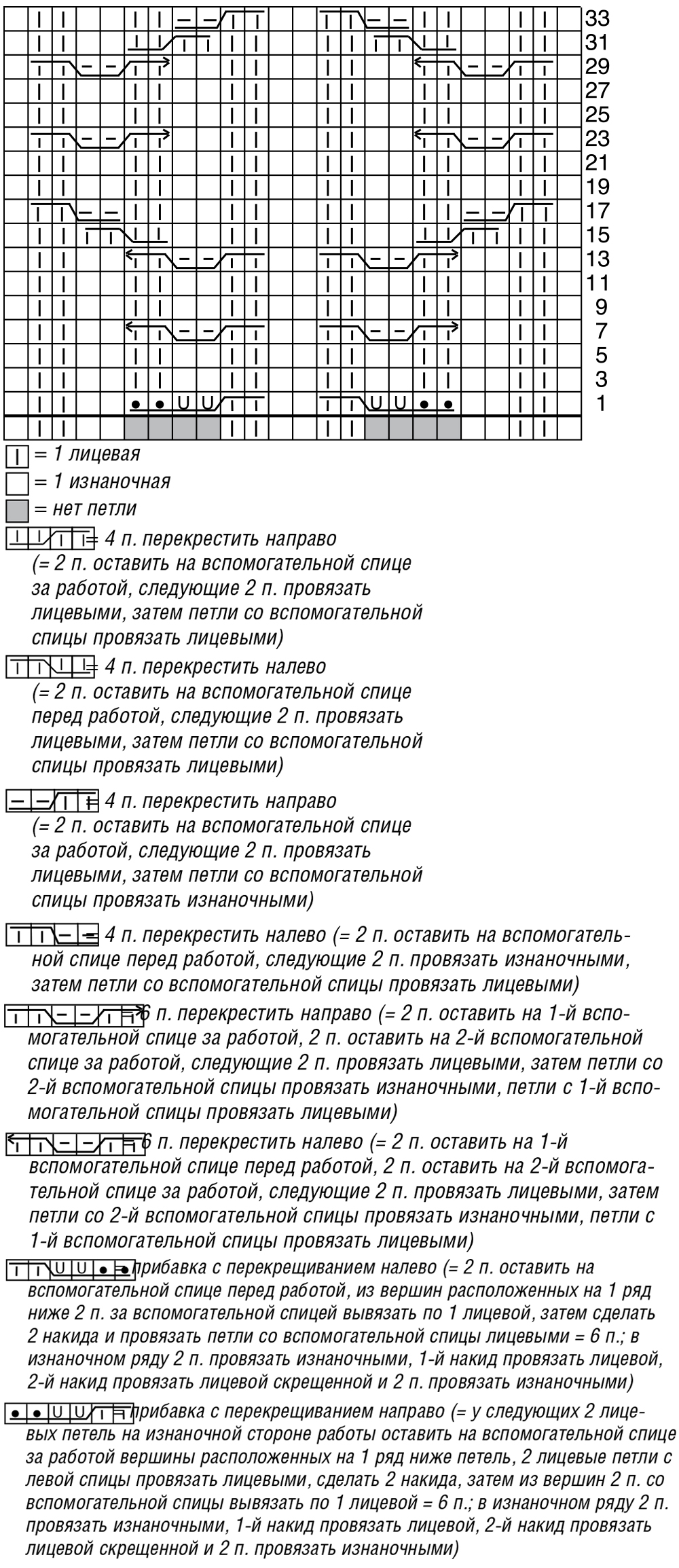 2 кромочные) = вязать согл. схеме. На ней даны лицевые ряды. В изнаночных рядах все петли провязывать по рисунку или согл. инструкции, накиды провязывать согл. инструкции. Постоянно повторять раппорт между кромочными. Для наглядности имеющиеся петли планки приведены под схемой. Выполнить 1 раз 1—34-й ряды, затем постоянно повторять 3—34-й ряды.