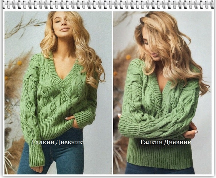 Красивый пуловер спицами для женщин, с крупным рельефным узором. Высокая резинка, объемный узор и глубокий V-образный вырез горловины, создают молодежный, стильный образ.