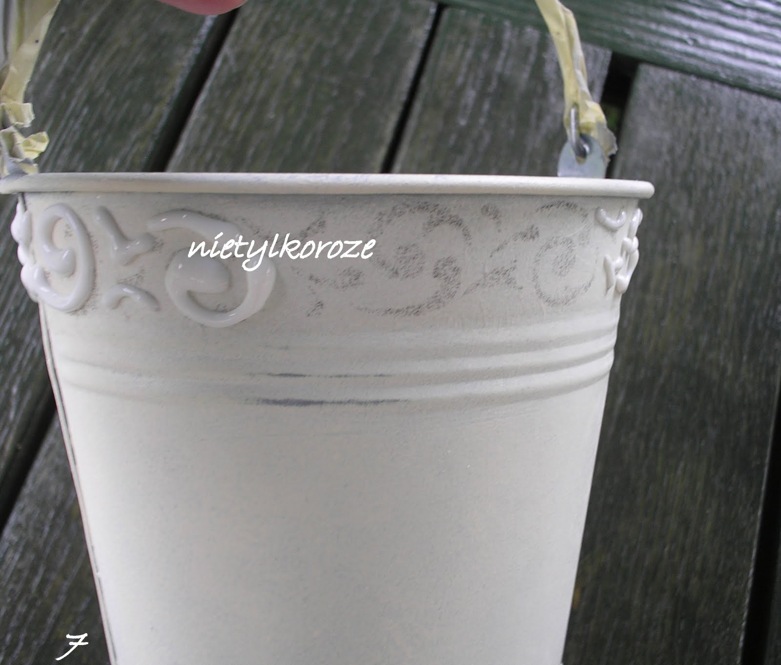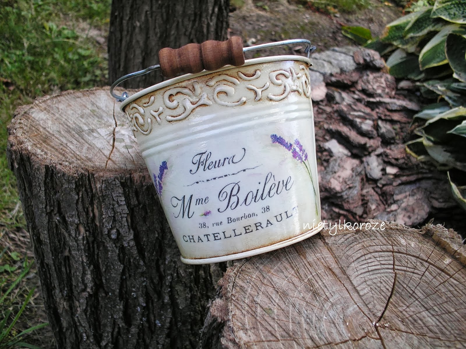 Декупаж металлического ведерка от http://nietylkoroze.blogspot.ru/2013/07/zawijaskowe-diy-i-konewka.html