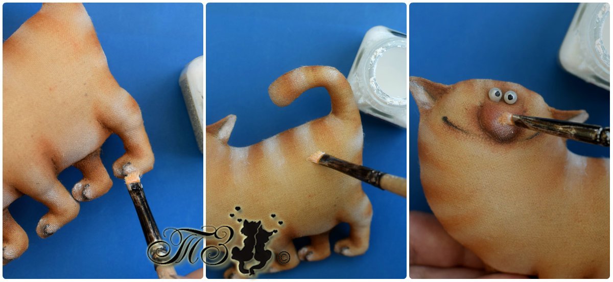 Белой же краской можно покрасить животик и внутри ушек, легонько оттенить выпуклости бедер четных лапок. Вот таким рыжим-полосатым получился у нас кот.