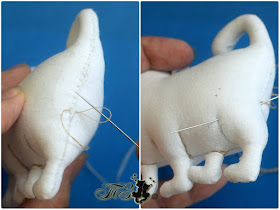 После того, как хорошенько набиты лапы и хвост, так же плотно набиваем всю тушку. Плотная набивка нам нужна для красивой утяжки и аккуратной росписи. На слабо набитой тушке утяжки будут заметно морщить.