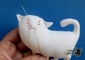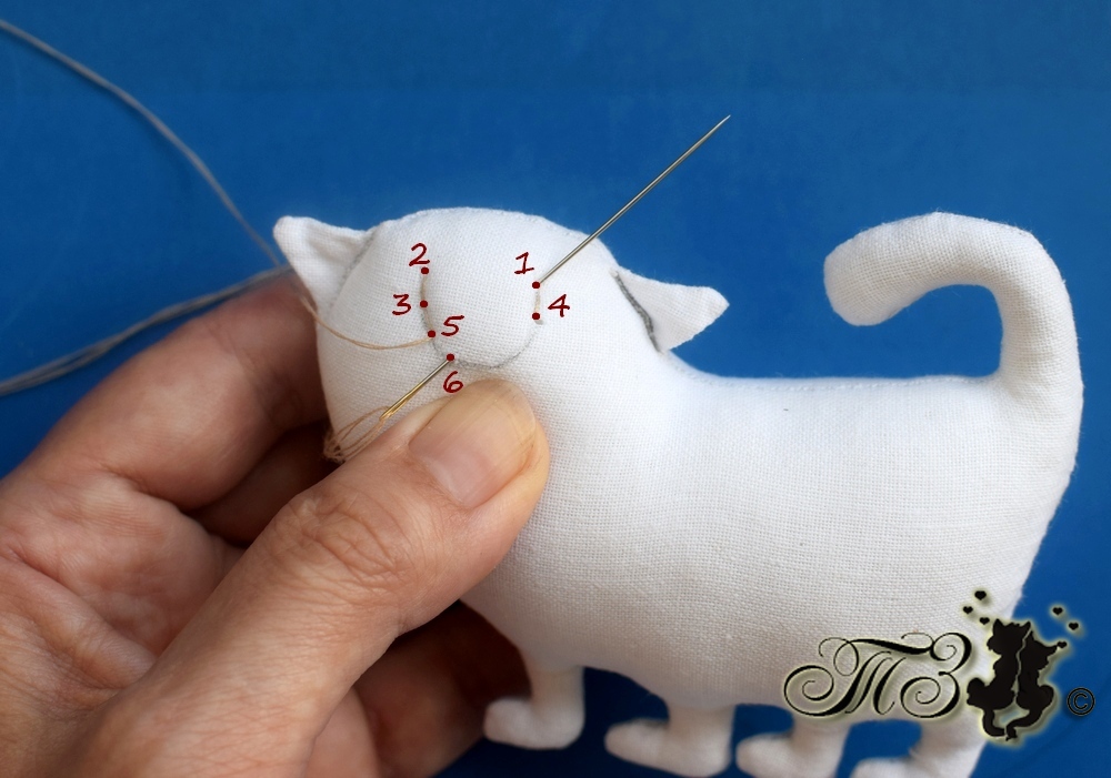 При этом не забываем, что начиная примерно с т.5 (утягивая нижний контур носа), все стежки внутрь игрушки делаем «с подкопом»: игла движется из точки в точку не по прямой, а по небольшой дуге, подхватывая и приподнимая набивку.
