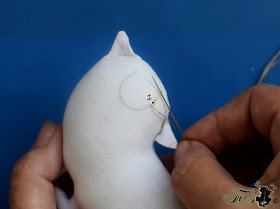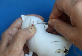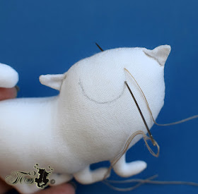 Закрепляемся на затылке. Точка утяжки должна быть примерно на середине головы немного ниже верхнего шва.Не удивляйтесь, я ничего не перепутала: просто эту утяжку я показываю на тушке другого кота, поэтому нос у него будет находится с другой стороны головы.