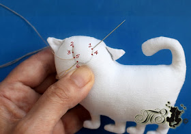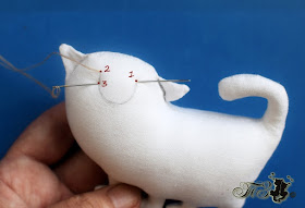 В т.1 делаем совсем маленький стежок (длиной примерно 1 мм, только чтобы не порвать ткань) вверх или вниз от точки закрепки, и переходим внутри тела игрушки на противоположную сторону носа в верхнюю точку (т.2). Нить практически не натягиваем, чтобы не исказить форму носа. В т.2 можно также сделать закрепку.
