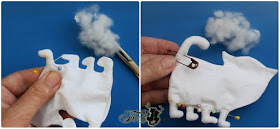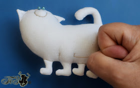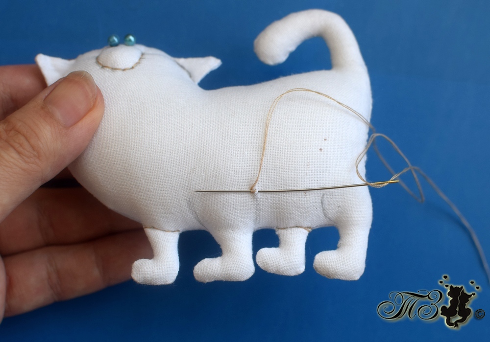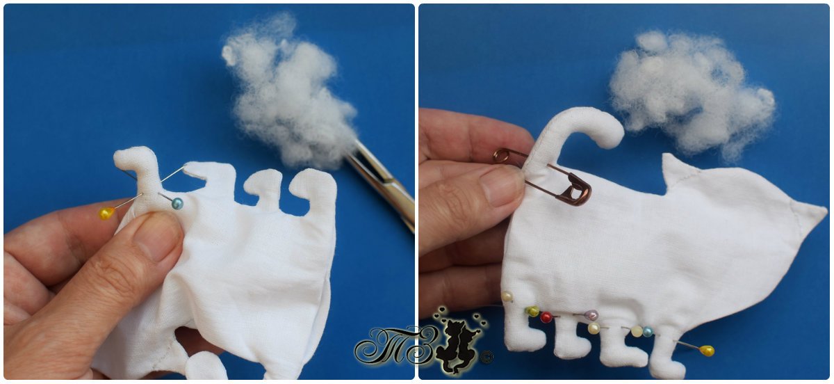 Набиваем кота в той же последовательности, что и выворачивали: сначала каждую лапку, потом хвостик. Чтобы наполнитель не выскакивал из узкой лапки или хвоста, после набивки сразу же фиксируем наполнитель в детали швейными или английскими булавками.